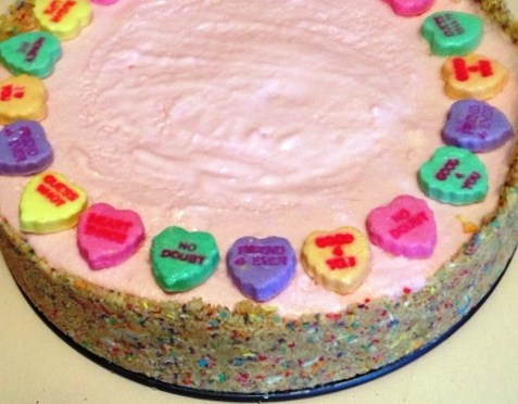 8. Pour filling into the crumb base and smooth out the top. Then, cover the entire thing with cling wrap and refrigerate for at least 4 hours. You'll see from Heather's original recipe that she included a whipped cream decoration before chilling the cheesecake. I needed to get it into the freezer so it would be ready for dessert, so we decorated with the conversation hearts and served it with icecream.